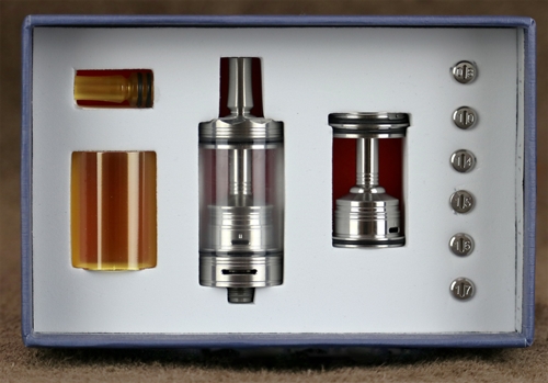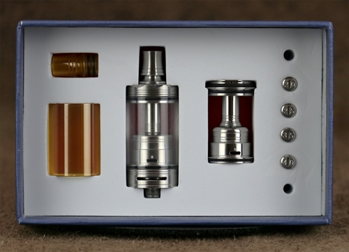 The atomizer comes fully equipped with multiple configuration options. It includes a 316L stainless steel drip tip and a Ultem drip tip, as well as a PCTG tank preinstalled and an additional Ultem tank.